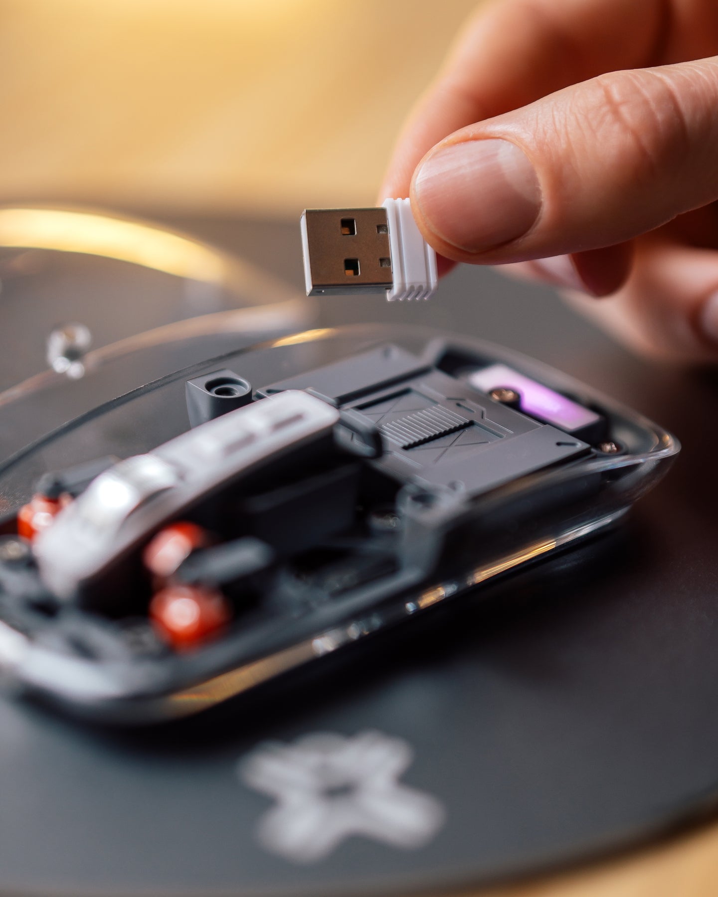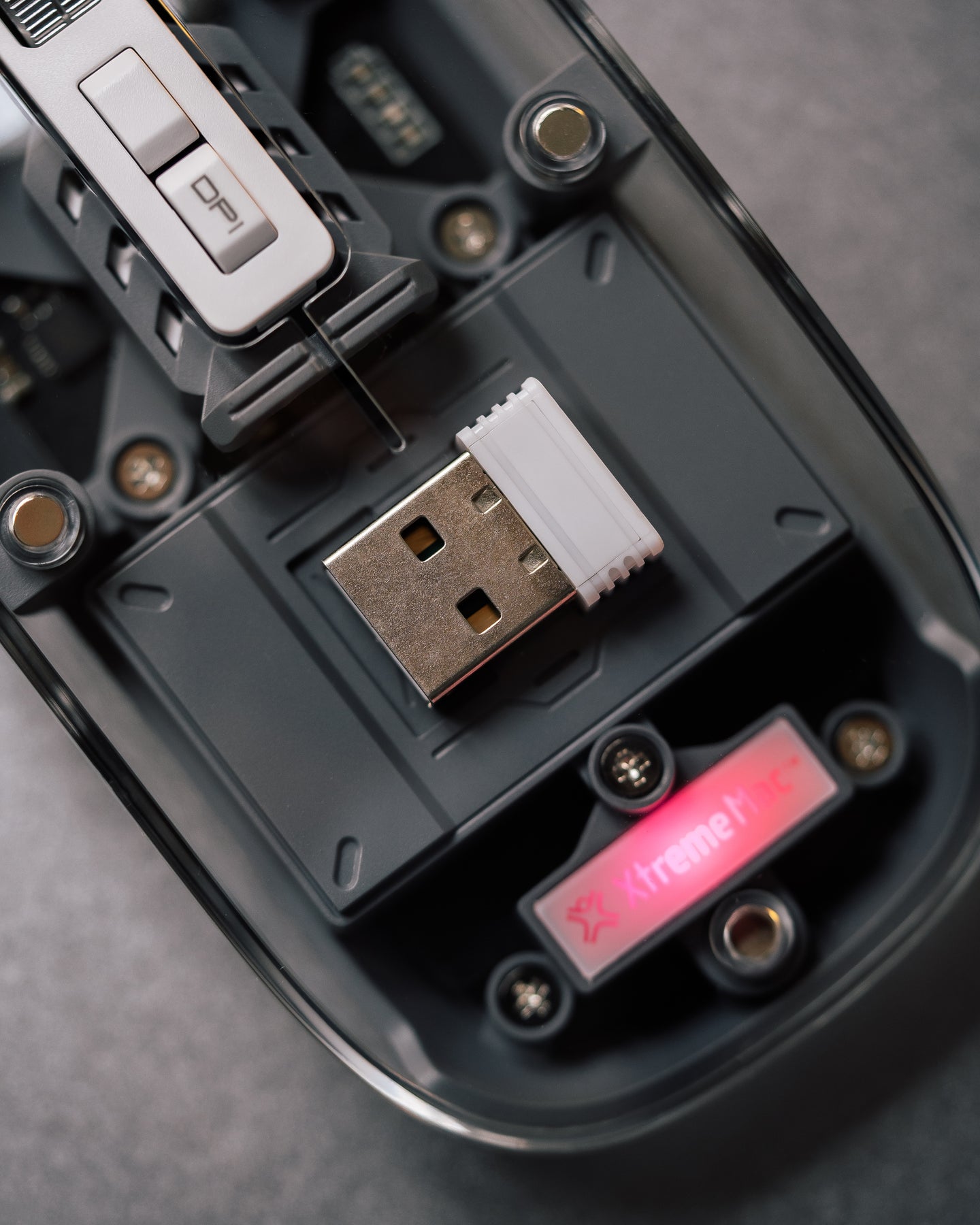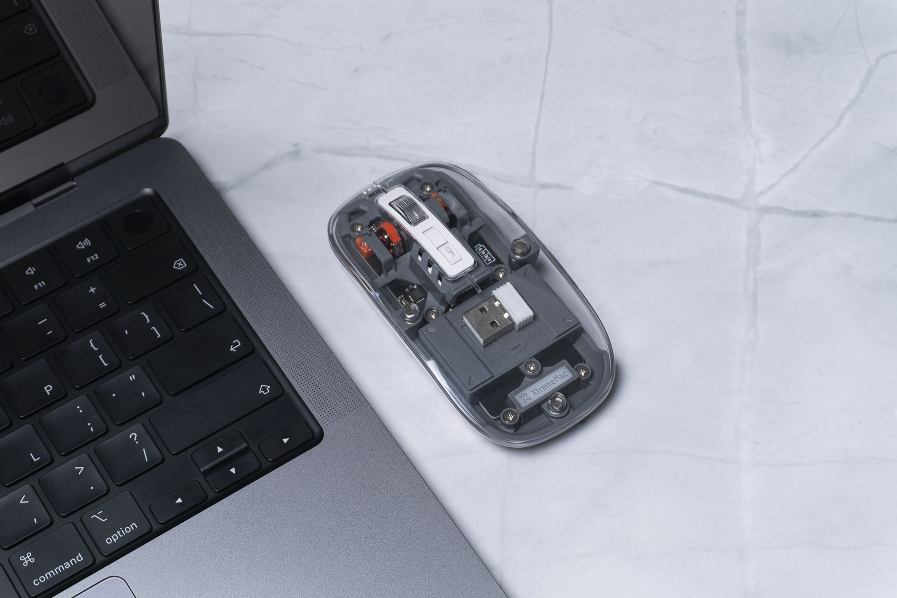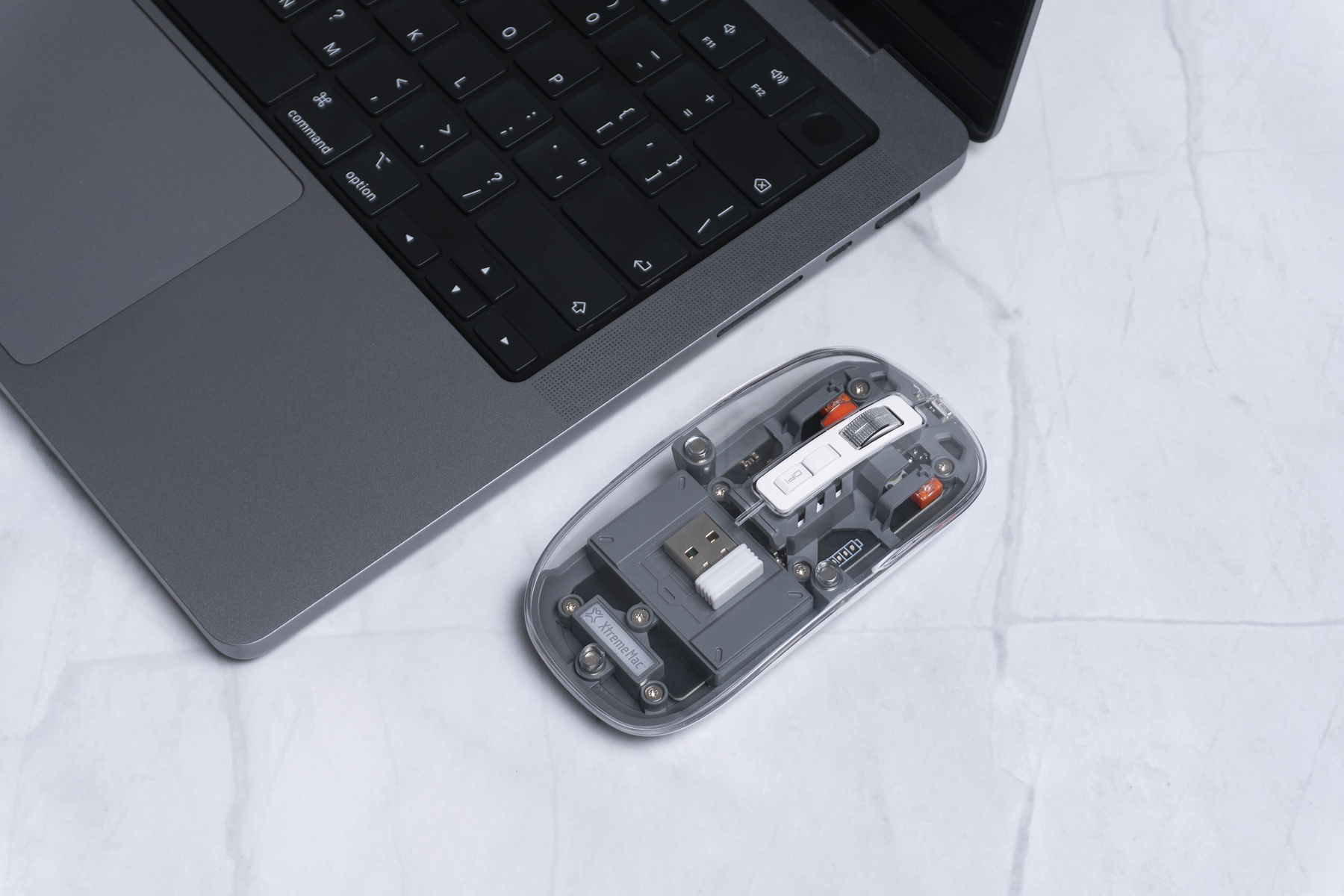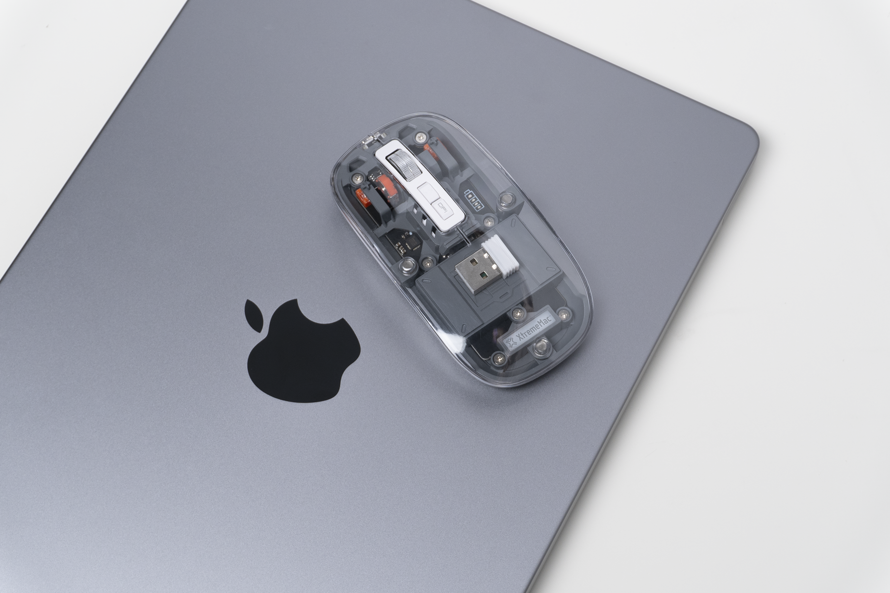 The USB-A connector stores easily under the mouse cover, thanks to its smart magnetic opening system.